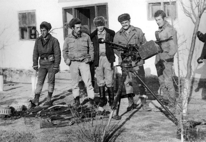 Наш десант был полной неожиданностью для противника, никакого сопротивления, но кое-кто начал уходить. Примерно в 1,5 км прямо передо мной, через ущелье, обнаружил быстро уходящую группу, трое на лошадях, двое на ишаках. Сам лег за ПК и с третьей очереди завалил одного, вместе с конем рухнул в ущелье, первый лично убитый дух. Остальные скрылись за обратными скатами. Вертолеты кружат над кишлаком, и вдруг пара «восьмерок» заходит на боевой курс и открывает огонь, хорошо из пулеметов, по группе моего взвода. Они попадали, рядом, буквально в сантиметрах, град пуль. Подумал – ну, все. Нет, вскочили и укрылись в близлежащем домике. Вертушки на второй круг заходят, а связи с ними нет, у меня радиостанция Р-148, диапазоны не совпадают, «Ромашка», для связи с «Ми-8» только у командира батальона. Вертолеты бьют НУРСами, море разрывов. Передаю комбату, что вертолетчики работают по своим, больше не заходят. Но у меня один солдат, рядовой Алиев, тяжело ранен. Вынесли его на высоту, загрузили в присевший вертолет, отматерили летунов, отправили. Закончили прочесывание кишлака, найден склад оружия и боеприпасов. Подошла броня из Кишима. При отходе майор Рябшев кричит: «Уничтожай матбазу!» Сам открыл огонь из СВД, он всегда с ней ходил, зажигательными по копнам соломы, которые размещались на крышах домов. Бойцам в радость, полетели трассеры из всех видов оружия, кишлак запылал. Я лично так и не понял – для чего? Прибыли в Кишим, подсчитали трофеи: два ДШК, РПД, полтора десятка БУРов, три СКС и даже несколько мелкашек ТОЗ-8, шесть противотанковых итальянских мин, боеприпасы. Сфотографировались на память.