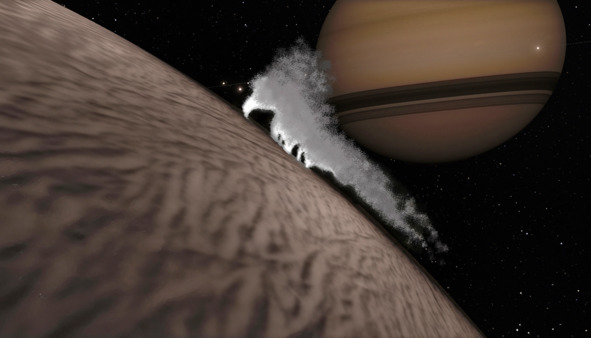 Энцелад является сравнительно небольшим небесным телом, его радиус всего-то пять сотен километров. Ускорение свободного падения на его поверхности составляет одну сотую земного, а потому ударивший вверх фонтан вовсе не обрушивается вниз водопадом, а вылетает в ближний космос, где микроскопические капли воды остаются на орбите, постепенно разрушаясь и исчезая под воздействием солнечного ветра. Фонтан в своей верхней точке раскрывается в виде величественного зонтика, вытянувшегося вверх на полторы или даже две сотни километров – сие зависи от скорости выбрасываемой из-под ледового панциря воды. Сам же выброс воды растянут во времени и происходит медленно, величественно и даже гипнотически, кажется, будто смотришь сильно замедленную видеозапись.