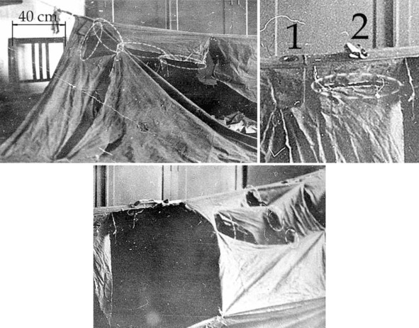 Кроме уже упомянутых, эти фотографии имеют и иной серьезный недостаток, о котором нельзя умолчать: ткань на месте одного из крупных разрывов отброшена таким образом, что заслоняет часть ската. Ее положение не позволяет видеть повреждения ткани, которые могли находиться в том месте. Перед фотографированием следовало воспроизвести естественное положение этого куска ткани. Кстати, подобная операция (т. е. возращение в первозданное положение) позволила бы судить о величине отсутствующих фрагментов палатки с исчерпывающей точностью, а не руководствоваться для этого весьма условной и малоинформативной схемой Генриетты Чуркиной.