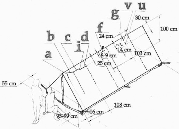 Прямоугольная изометрическая проекция палатки группы Игоря Дятлова с указанием разрезов правого (от входа) ската крыши. Рисунок выполнен с сохранением пропорций; рядом с палаткой для большей наглядности изображен мужчина комплекции Юрия Дорошенко в положении стоя и сидя. Штриховыми линиями показаны длинные разрезы в направлении «конек – боковая стенка», сплошными жирными – короткие разрезы, сделанные явно с иной целью, нежели длинные. Их приблизительные размеры: а = 25 см, Ь = 26 см, с = 32 см, с = 34 см, i = 6,0—6,5 см, f= 16,5 см (этот разрыв оставлен ледорубом Слобцова 26 февраля 1959 г.), g – разрез неопределенной длины, т. к. на исходном фотоснимке его заслоняет завернутый кусок брезента, про него можно сказать лишь, что его длина не менее 19 см и не более 72 см, v = 14,5 см, и = 13 см. Ввиду недостаточного качества исходной фотографии показаны и измерены не все короткие разрезы, особенно в дальней от входа части палатки.