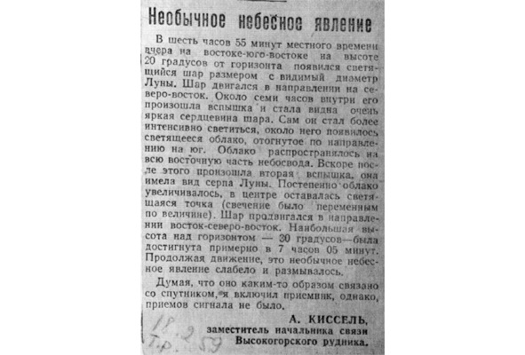 Следователь Иванов не поленился раздобыть номер газеты «Тагильский рабочий» от 18 февраля 1959 г., которая – минуточку! – не продавалась в Свердловске и вырезал из него заметку о необычном небесном явлении. Никаких пояснений своим манипуляциям следователь в деле не оставил, предоставив тем самым заинтересованным лицам самостоятельно ломать голову над скрытой логикой своего поведения.