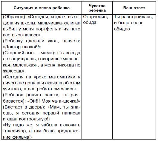 В-четвертых, в вашем ответе также иногда полезно повторить, что, как вы поняли, случилось с ребенком, а потом обозначить его чувство. Так, ответ отца в предыдущем примере мог бы состоять из двух фраз: