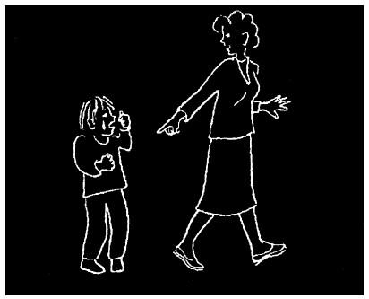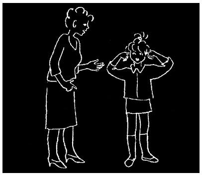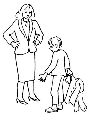 Заметим, что в этом разговоре первые же ответы мамы на слова мальчика («Не можешь сам справиться», «Тебе не нравится рубашка») настраивают ее на то, чтобы действительно послушать его, услышать его ответы, а не только свои приказания. В результате сын охотно делится своей действительной проблемой, и мать готова ее принять. Если же разговор идет первым способом, то неизбежно появляется следующий тип родительских фраз.