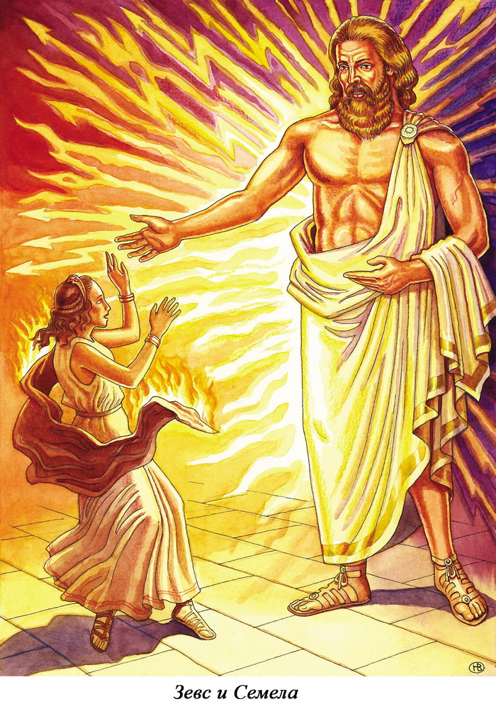 Семела, околдованная Герой, пришла в недоумение, как это она сама прежде не догадалась удостовериться, что её возлюбленный именно тот, за кого он себя выдаёт. Во время следующего визита Зевса девушка попросила его поклясться, что он исполнит её просьбу. Зевс, конечно, пообещал, не предполагая, что Семела попросит его ни больше ни меньше, чем предстать перед ней в своём истинном облике, как если бы он был в своём дворце на Олимпе, с молниями и громами. Громовержец попробовал было урезонить Семелу, чтобы она не настаивала на своей сумасбродной просьбе, но та заупрямилась и ни в какую не соглашалась на доводы возлюбленного – так ей хотелось докопаться до истины. Делать нечего, пришлось Зевсу исполнять обещание. Как он ни старался умерить мощь громовых разрядов, но несчастная царевна мгновенно сгорела и превратилась в горстку пепла.