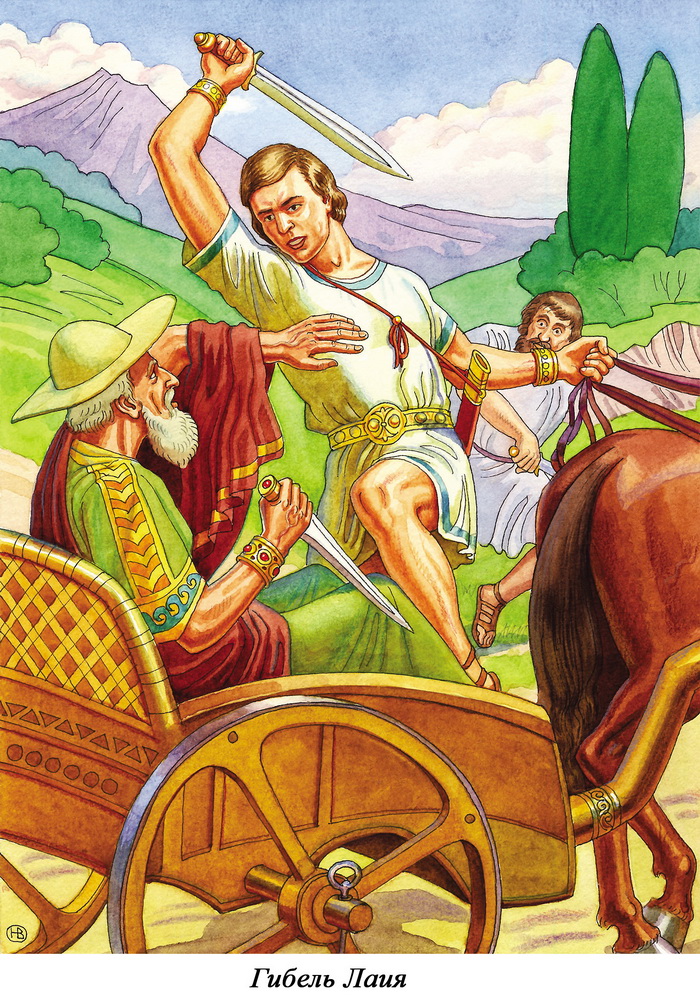 – Прочь с дороги! – заорал слуга и кнутом хлестнул Эдипа по плечу. Эдип изловчился, ухватился за кнут, резко дёрнул его на себя и сбросил обидчика на дорогу. Старик приподнялся в повозке и больно ударил Эдипа по голове посохом. Эдип потерял равновесие, и лошади поволокли его по земле.