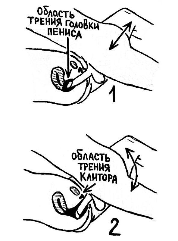 Есть и другие позиции, в которых член можно использовать так же хорошо и тем самым легко довести девушку до оргазма. Например, переплетая ноги с ее ногами, и, конечно же, когда женщина находится сверху и имеет возможность сама найти наилучшее положение, чтобы сохранить нужный ей контакт. Очень удобно и такое положение: мужчина лежит на левом боку, женщина на правом; она проводит свою правую ногу между его ногами, а левой ногой взбирается на его правое бедро, образуя таким образом как бы двойной бутерброд из ног. Что же касается всех остальных позиций, то желательно чтобы на помощь Вашему члену пришел и Ваш палец. Допустим, Вы ввели ей член сзади. В таком случае поддерживать контакт клитора с пальцем совершенно необходимо, иначе клитор может остаться совершенно не при деле, а другого способа занять его нет. Безусловно, есть много женщин, которым не требуется постоянная стимуляция клитора, но их меньшинство, и, кроме того, это вовсе не означает, что им это не нравится. Им это не обязательно, но они совсем не против! Просто все время имейте в виду, что клитор реагирует совершенно так же, как член, и так же чувствителен к оргазму.