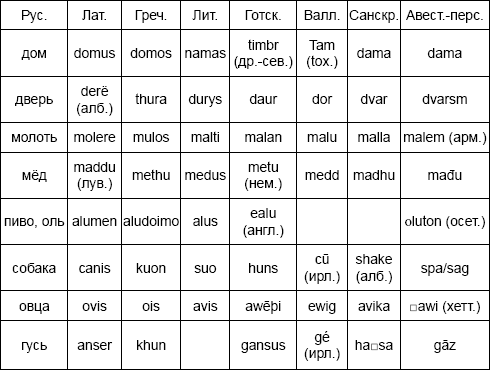 Ученые не удовольствовались сравнениями. Для упомянутых наиболее древних областей языков (системы родства, исчисления и т. д.) довольно быстро появились и реконструкции общих праиндоевропейских терминов (см. табл.).