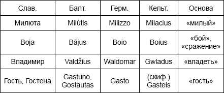 Однако наиболее древние основы и.-е. имен все-таки сохраняли не только смысловую, но и звуковую близость. Поэтому так созвучны и произведенные от них имена. Например, инд. Raghurama, лит. Ramelis герм. Rammi-linc, кельт. Ramilus (от rama – «спокойствие»). Герм. Maro, кельт. Мага, фрак. Maris, малоазийск. Mareis (от mar – «большой», «великий»). Др. – прус. Gaylenne, герм. Gailanus, кельт. Gailonius, илл. Gailonius, слав. Zelodrag (от «сильно», «страсть» или «жалеть»).