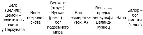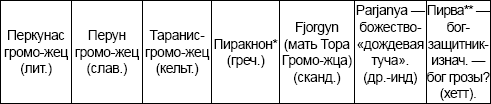 Мало того. Ученые, на основании анализа многочисленных памятников архаического искусства и мифологических текстов предположили существование изначальных, общих для всех и.-е. народов типов богов, как (по А.Н.Фанталову): «Бог Грома» (индийский Индра, скандинавский Тор, кельтский Таранис, славянский Перун, балтский Перкунас); «Бог Ясного Неба» (греческий Зевс, скандинавский Тор, индийский Дьяус, балтский Диевас, славянский Дий); «Великая Богиня» (греческая Гера, индийская Приттхиви, скандинавская Ерд, славянская Макошь, балтская Земес Мате, ирландская Дану); «Божественные Близнецы» (греческие Диоскуры, индийские Ашвины, балтские сыновья Диеваса); «Бог Земных Сил» (греческий Дионис, индийский Рудра, скандинавский Фрейр, славянский Велес, балтский Веле, кельтский Цернунн); «Культурный Герой» (греческие Гермес и Геракл, скандинавский Один, славянский Геровит, ирландский Луг).