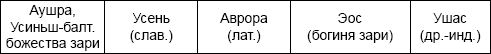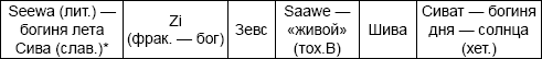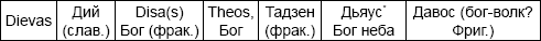 Впрочем, имена и функции многих и.-е. божеств до того схожи, что для выявления их родства не нужно никаких преданий. «Грозовой дракон» Аждахак армян, Ажи-Да-хака «Авесты», Эхидна греков, так или иначе связаны с демонической силой. Прусский Пус(к)айтс, древнеиндийский Пусан, греческий Пан – с землей и лесом. Шива – у индусов и Сива (Сив) у вандалов и скандинавов с плодородием. Балтийский Мокас и славянская Макошь связаны не только с плодородием, но и с водой, что объединяет их с инд. – будд. понятием Мокша (букв, «истечение»). Славянский Даждь-бог и кельтский Дагда олицетворяли благо, совершенство. И т. д. (см. табл.)