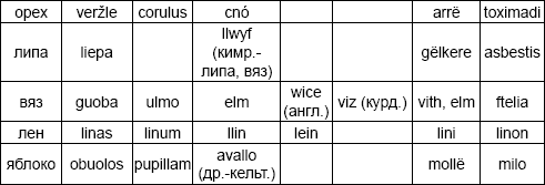 При этом список и.-е. растений Иванова – Гамкрелидзе действительно нуждается в серьезной проверке. С одной стороны, в нем пропускаются совпадения в названии ряда северных деревьев, например, ольхи (лат. Ainus). С другой – часть растений была далеко не так общеизвестна. Скажем, бук в древности знали италики, греки и германцы, но только от последних и довольно поздно об этом дереве услышали славяне и балты. Этот давно известный «аргумент бука» используется для того, чтобы подчеркнуть расположение славяно-балтского массива восточнее границы произрастания дерева (Нижний Неман – Нижний Дунай). Слова «тисс» славяне (во всяком случае, восточные) также не ведали, поскольку, как отмечал еще В.И. Даль, в их песнях «тисовая кровать переиначена в тесовую, в чем нет смысла».