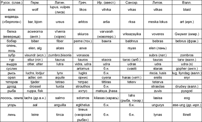 Итак, подведем итоги. Исключив вышеуказанные позднозаимствованные южные элементы, получаем следующую картину животного мира, окружавшего Ариев (см. табл.).