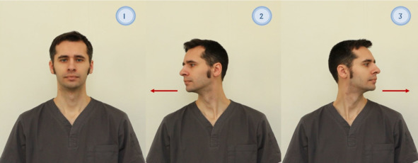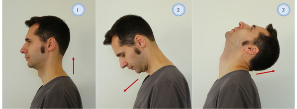 Рисунок 2. Наклоны головы вперед и назад. 1. Исходное положение («сидя» или «стоя»); 2. Наклон головы вперед; 3. Наклон головы назад.