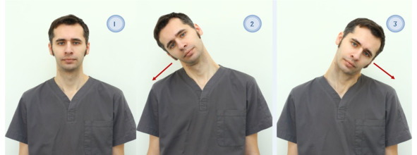 Рисунок 3. Наклоны головы в стороны: 1. Исходное положение («сидя» или «стоя»); 2. Наклон головы вправо; 3. Наклон головы влево.