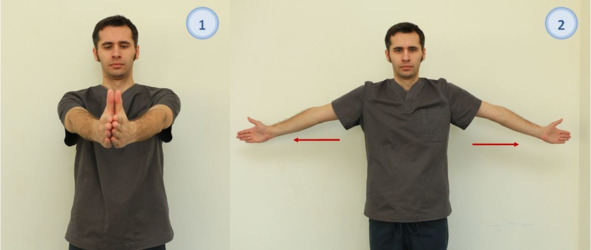 Рисунок 4. Упражнение лечебной физкультуры: 1. Исходное положение «стоя» или «сидя», руки выпрямлены вперед перед собой, соприкасаясь ладонями; 2. Разводим руки в стороны. Повторяем 15—20 раз.