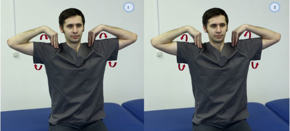 Рисунок 5. Упражнение лечебной физкультуры, используется стол для Войта-Бобат терапии: исходное положение «сидя», руки согнуты в локтях, кисти приведены к плечам, производим поочередно вращение руками вперед (1) и назад (2). Выполняем в течение 5 мин.