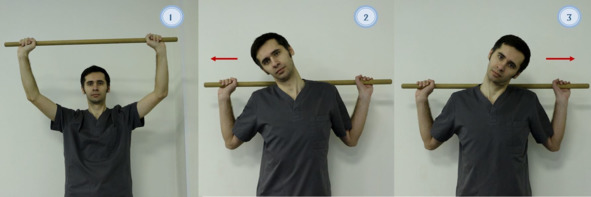 Рисунок 6. Упражнение лечебной физкультуры, используется гимнастическая палка: 1. Исходное положение «стоя» или «сидя», руки слегка согнуты в локтях, подняты вверх над головой, в руках гимнастическая палка длиной 90—100 см.; 2—3. Гимнастическая палка опускается за спину, выполняются наклоны головы поочередно в стороны с задержкой в положении на 10—15 сек. Вся комбинации повторяется 5—10 раз.