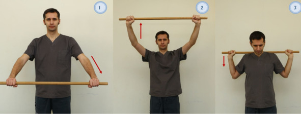 Рисунок 7. Упражнение лечебной физкультуры, используется гимнастическая палка: 1. Исходное положение «стоя» или «сидя», выпрямленные вперед руки опущены вниз, в руках гимнастическая палка длиной 90—100 см; 2. Руки поднимаем вверх над головой слегка согнув в локтях; 3. Гимнастическая палка опускается за спину; Каждое упражнение выполняется с задержкой в положении на 10—15 сек. Вся комбинации повторяется 5—10 раз.