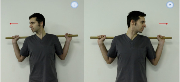 Рисунок 8. Упражнение лечебной физкультуры, используется гимнастическая палка: 1—2. Исходное положение «стоя» или «сидя», в руках гимнастическая палка длиной 90—100 см. Гимнастическая палка опускается за спину, выполняются повороты головы поочередно в стороны с задержкой в положении на 10—15 сек. Вся комбинации повторяется 5—10 раз.