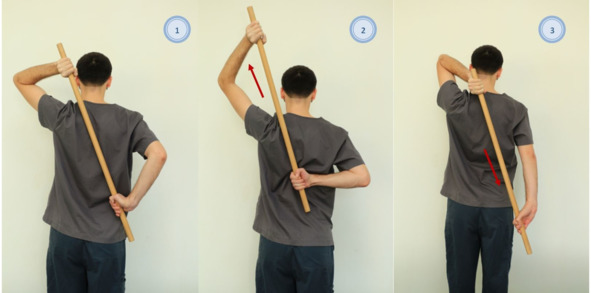 Рисунок 9. Упражнение лечебной физкультуры, используется гимнастическая палка: 1. Исходное положение «стоя» или «сидя», руки согнуты в локтях и заведены за спину (левая руку сверху, правая снизу), в руках гимнастическая палка длиной 90—100 см.; 2—3. Гимнастическая палка поочередно поднимается вверх и опускается вниз с задержкой в положении на 10—15 сек. Вся комбинации повторяется 5—10 раз с изменением положения рук (левая руку сверху, правая снизу/правая руку сверху, левая снизу).