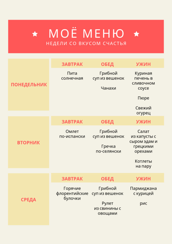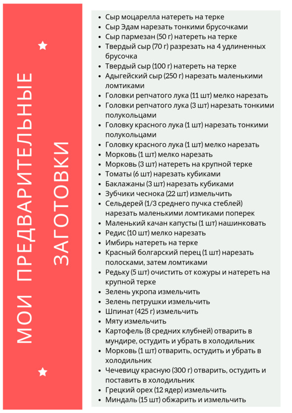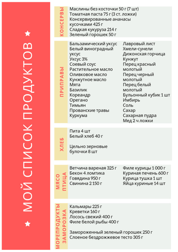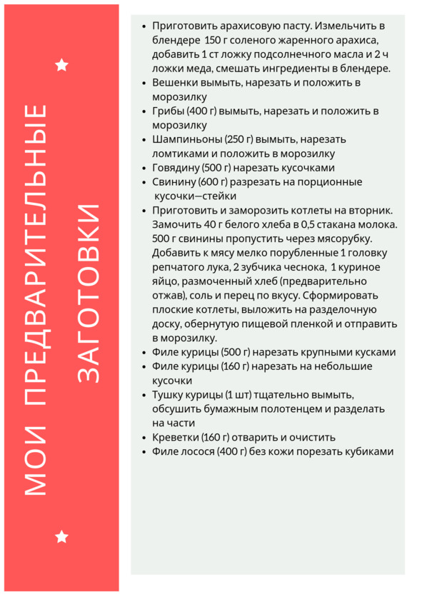 Я вспоминала и записывала рецепты всех блюд, которые готовила. Составила меню на неделю. Затем выписала все ингредиенты, которые используются в этих блюдах, объединила их по категориям. Так получился простой и понятный список продуктов, которые необходимо купить, посетив магазин всего один раз в неделю. Кстати, этот список помог прилично сэкономить, не тратя средства на что-то ненужное. Ведь продукты брали исключительно те, которые необходимы. Следующим шагом было пробежаться по меню и составить список продуктов, которые можно предварительно приготовить или заранее обработать нужным образом. Так, например, измельчить лук и чеснок, натереть морковь и сыр, разрезать мясо и рыбу на порционные куски можно заранее на всю неделю.