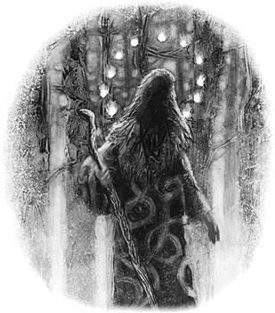 Он долго брёл и сперва подумал, что красный всадник обманул его, но внезапно туман впереди в самом деле стал складываться в очертания дома. Вокруг ярко замерцали рыжеватые огоньки, и Варн, с ужасом оглядевшись, понял, что это не просто огоньки, а светящиеся глаза горящих черепов. Сам того не заметив, он ступил на дорожку, ведущую к жилищу Ярги.