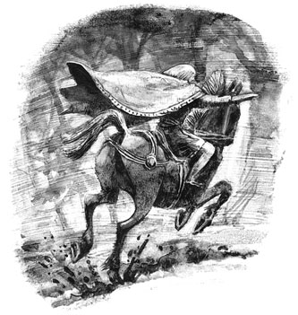 Но тут вдалеке вдруг загорелся красный сполох, а следом раздался топот, перемежающийся чавканьем мягкой болотной земли под чьими-то ногами, и ховала отвернулся от Варна, привлечённый звуком. Скоро туман перед красным сполохом расступился, и навстречу Варну понёсся всадник в алых одеждах. Копыта его лошади лишь слегка касались земли, зачерпывая воду. У всадника было спокойное светлое лицо, и потому мальчик крикнул ему: