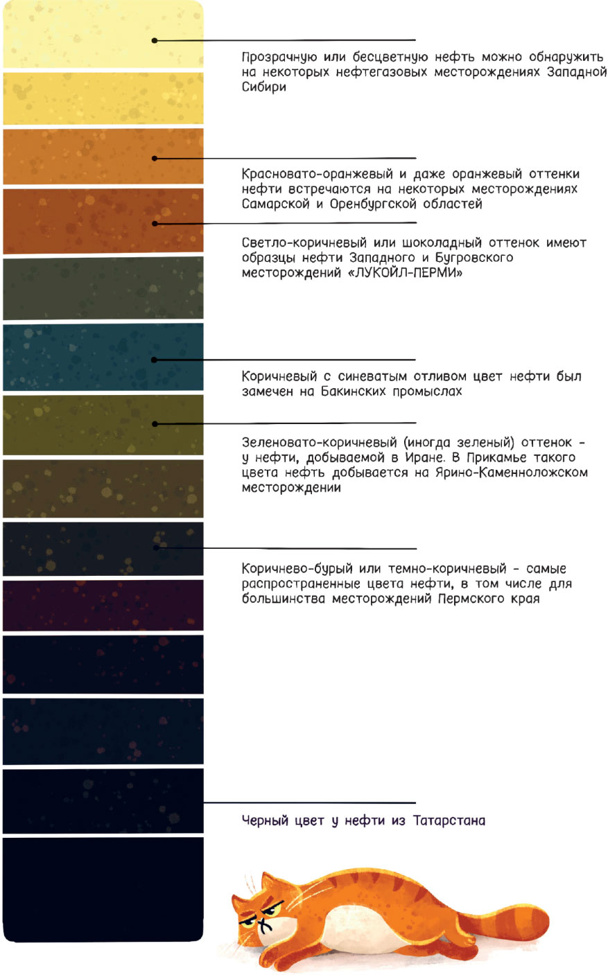 Глубоко под землей можно обнаружить оранжевую нефть. Такого же оттенка, как твои волосы или шерсть у Болтуши. Это происходит за счет большего количества легких углеводородов. Такая нефть встречалась на некоторых месторождениях в Оренбургской области.