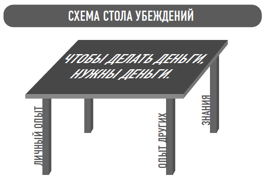 Если бы кто-то пришел ко мне и попытался переубедить меня, я бы даже не стал его слушать. Представьте себе стол, на котором лежала моя вера в то, что «для того, чтобы делать деньги, нужны деньги». Стол прочен лишь настолько, насколько прочны ножки, на которых он стоит. Ножки представлены моим личным опытом, опытом других и знаниями, которыми я обладал до этого момента. Мой стол был прочным. От чего меня защищало это убеждение? Возможно, от страха неудачи.