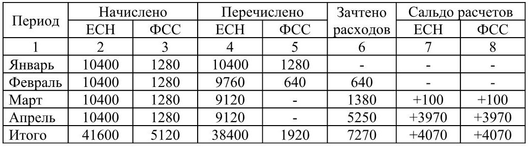 Таблица 2 – Расчеты ЗАО «Восток» по ЕСН за 4 месяца 2005 года (р.)