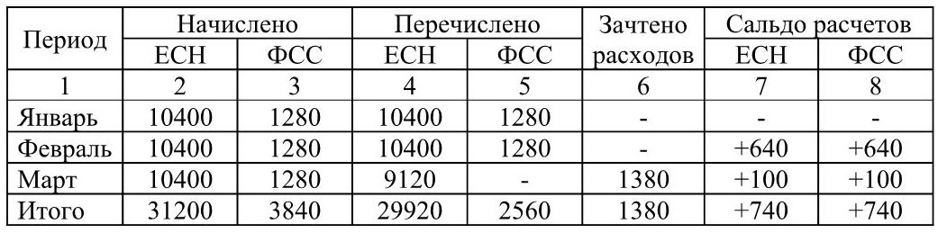 Изменим условия предыдущего примера. Предположим, что за февраль ЗАО «Восток» уплатило страховые взносы на государственное социальное страхование в размере начисленных взносов. Расчеты в ЗАО «Восток» по ЕСН за январь – март 2005 года представлены в таблице 3.