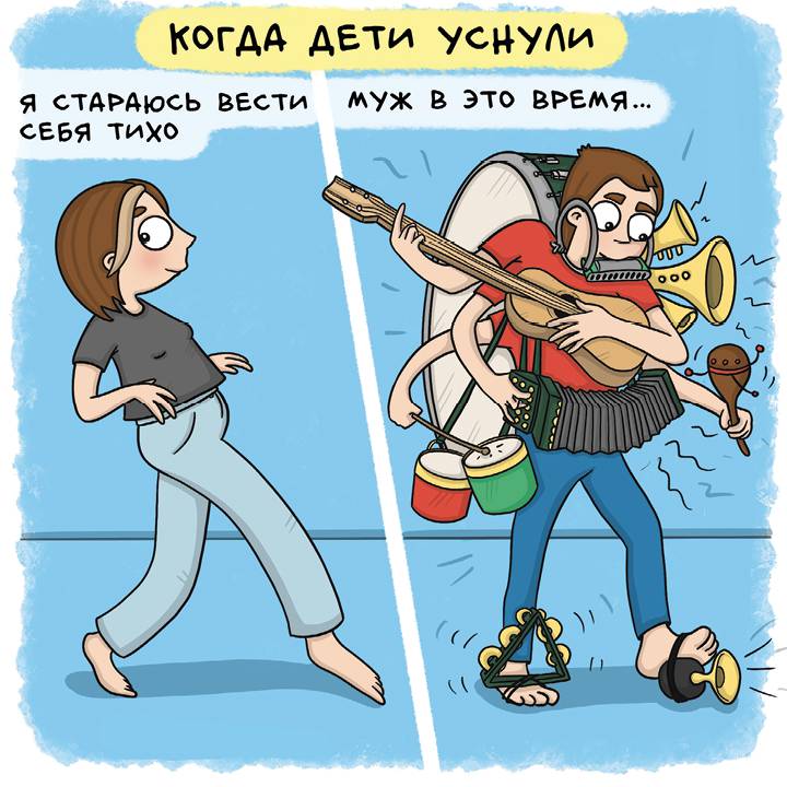 Когда я стала мамой, меня начал бесить муж. А точнее, то, как громко он все делает. Я старалась соблюдать полную тишину, боялась даже ходить, пока ребенок спит. А он спокойно хлопал дверьми, стучал ложкой в чашке, громко разговаривал и не переживал о том, что разбудит малыша. Каждое его движение поднимало во мне бурю эмоций! Ну неужели тяжело ходить на цыпочках и говорить шепотом? Я же это делаю, почему он не может? Особенно это выводит из себя, когда ты битый час укладывала ребенка спать, качая его на своих онемевших руках, удачно положила в кроватку и тихонечко отползаешь в сторону дивана, мечтая о горячем чае. А тут он! БАЦ, ХРЯСЬ, ХЛОП, «а что можно поесть?» Ох, видели бы вы мое выражение лица в те моменты… И как муж не проваливался сквозь пол, не пойму.