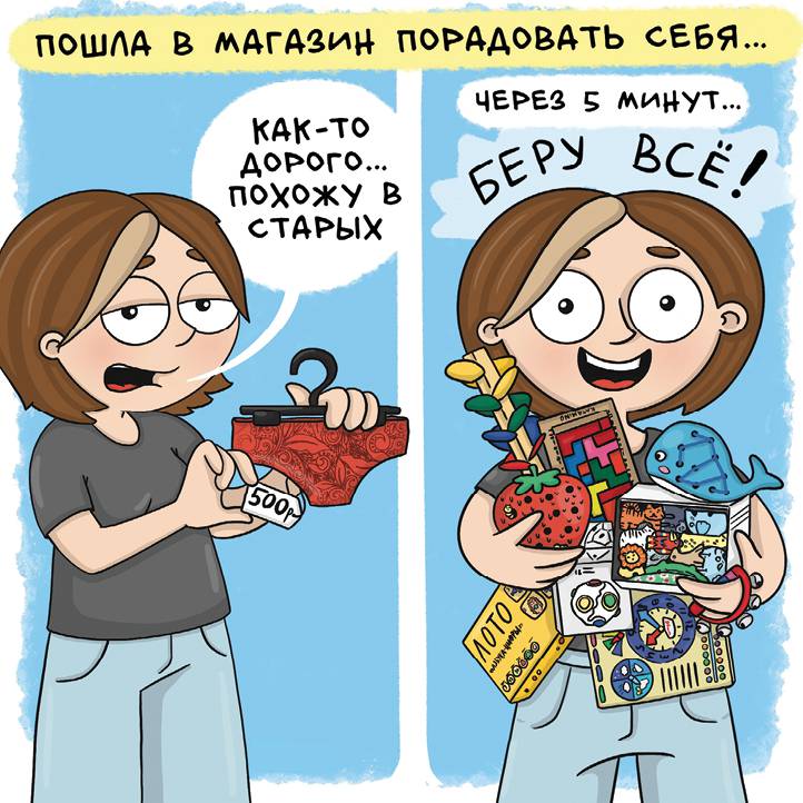 Я продолжала ходить в старом и поношенном, пока сын разбрасывал игрушки по всем углам и даже не замечал их пропажи. Не знаю, почему мне так легко было тратить на него и так сложно позволить что-то себе. Может, мне хотелось, чтобы кто-то позаботился так же и обо мне? Но ведь если ты сама себя не ценишь и не любишь, то другие этого тем более делать не будут. Это я поняла не так давно, хорошо поработав со своей самооценкой, и теперь наконец могу пойти и купить себе сразу пять новых трусов, а еще прозрачный халатик и шелковую сорочку. И когда я начала позволять себе больше, разрешать то, что хочется, то как будто вся семья стала счастливее. Я больше не ворчу на мужа и не злюсь, когда он покупает себе очередную рубашку, детская не завалена ненужными предметами, а я снова чувствую себя женщиной.