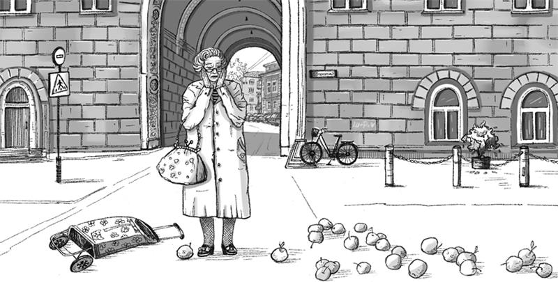 Рюкзак резво подпрыгивал на спине. Пятки остервенело колотили по асфальту. Я громко выдохнул. Снова обернулся и… со всего маху влетел в какую-то коляску. Ноги резко затормозили, тело описало в воздухе дугу, рюкзак зацепился за что-то и отлетел в сторону, локоть проехался по асфальту… Позади колёсами вверх валялась цветастая сумка-тележка, от неё в разные стороны, как жуки-пожарники, разбегались красные яблоки.