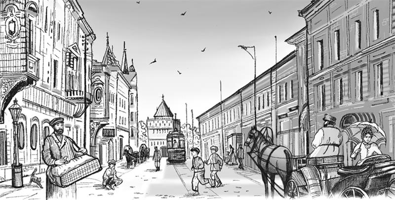 Когда я бродил по городу, смотрел фотки в Музее фотографии, гуглил легенды Нижнего, у меня возникало странное чувство, будто город хочет мне что-то сказать… Я стал замечать на Покровке необычных, словно выпавших из прошлого людей. Худощавого мужчину с узкой бородкой в старомодном полосатом костюме-тройке, звонко цокающего подковами высоких длинноносых туфель и опасливо озирающегося по сторонам. Дородную тётушку в плаще с пелериной и тирольской шляпке с пером, выпорхнувшую из магазина тканей с забавным названием «Пуговка». Сердитого старичка в фетровой шляпе с заломом и загнутыми вверх полями за столиком у кофейни «Чёрточка». Он не спускал с меня глаз и нетерпеливо постукивал витой деревянной тростью.