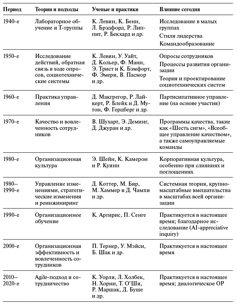 На наш взгляд, наиболее полную периодизацию ОР предлагает Д.Л. Андерсен [Andersen, 2023]. В своей работе он описывает восемь основных традиций исследований и практики ОР, отмечая, что, хотя они смешиваются и пересекаются, эти тенденции более или менее исторически следуют друг за другом и дают целостное представление об истории трансформации этой области. Адаптированная периодизация Д.Л. Андерсена представлена в таблице 1.2 [Ibid., р. 39]. Подходы, обозначенные в этой таблице до 1990 г., обозначаются автором как подходы первого поколения ОР. Временная рамка 1990–2020 гг. объединяет подходы второго поколения ОР.