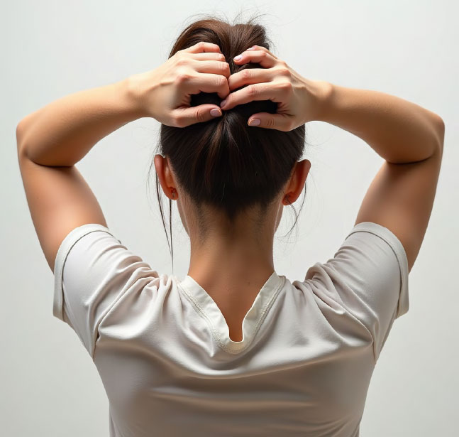 4. Складываем руки в замок, кладем на затылок. Пытаемся отвести голову назад, но руками оказываем сопротивление. Удерживаем 15–20 секунд (см. рисунок на следующей странице).
