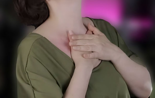 5. Сидим прямо. Плечи опущены. Наклоняем голову вправо. Ставим пальцы обеих рук на середину левой мышцы шеи грудино-ключично-сосцевидной мышцы и начинаем как бы растягивать ее от центра к периферии поглаживающими движениями. Повторяем по пять раз с каждой стороны.