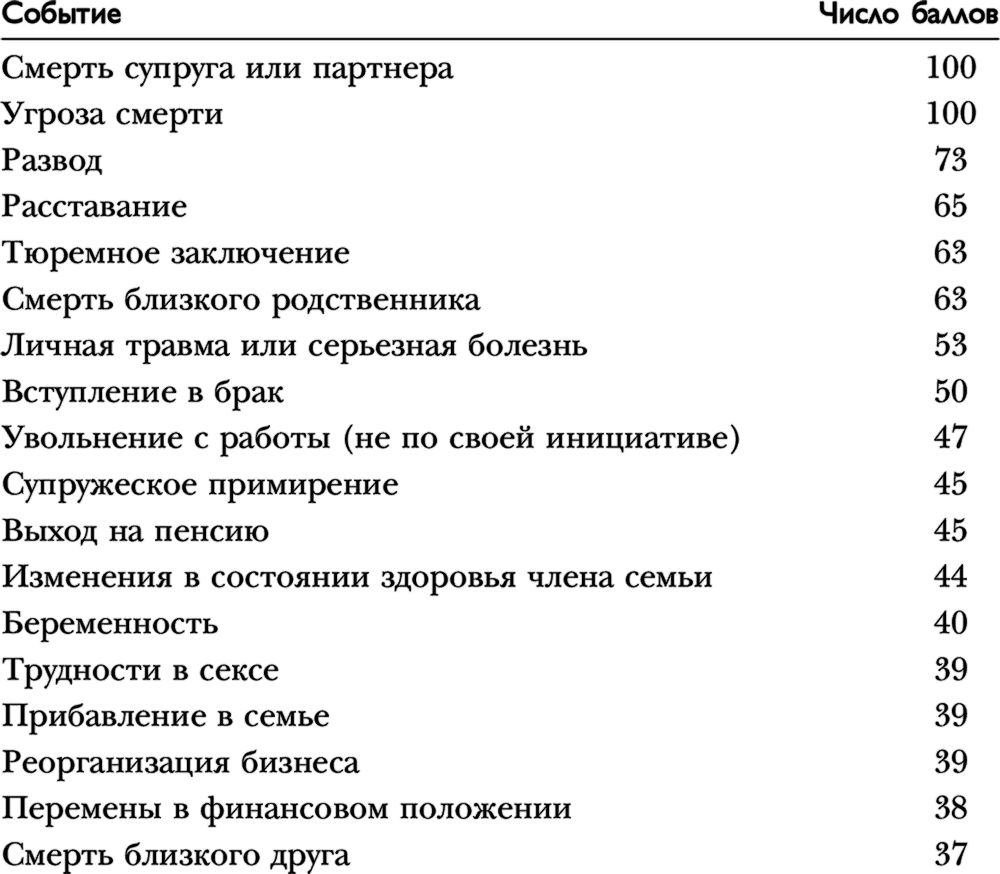 Все главные события нашей жизни порождают некоторый стресс, и вопрос о том, сохраните вы здоровье или заболеете, решает ваша способность или неспособность адаптироваться к переменам. Психиатры Томас Холмс и Ричард Рей решили выяснить, влияет ли стресс на недуги. Они опросили боле 5000 пациентов, задавая им вопрос о том, случались ли с ними за предшествующие два года какие-либо из 44 важных жизненных событий. Ниже приведена созданная ими таблица, которую они назвали тестом социальной адаптации. Этот тест показывает сравнительный уровень стресса, связанного с различными жизненными событиями.