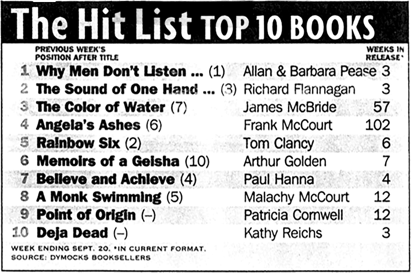 Не прошло и месяца, а «Почему мужчины не умеют слушать, а женщины – читать карты» уже стала номером один в списке австралийских бестселлеров. Она занимала первую позицию три месяца и была распродана общим тиражом более 50 000 экземпляров. Мы вернулись в бизнес!