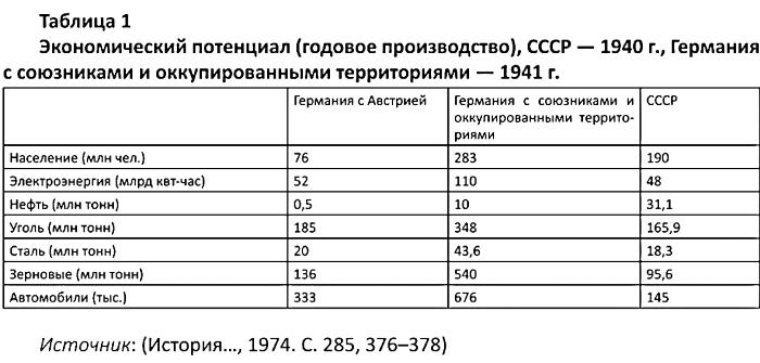 С чисто количественной точки зрения экономический потенциал Германии действительно по большинству позиций значительно превосходил экономический потенциал СССР. Производство основных видов промышленной продукции в Германии вместе с Австрией значительно превосходило объемы производства в СССР – за единственным исключением: уровень добычи нефти в нашей стране был существенно выше. Германия, кроме того, поставила себе на службу ресурсы своих союзников (Италии, Венгрии, Румынии, особенно ценной для Германии наличием нефтяных месторождений, Финляндии). Пожалуй, еще более важным для Германии было использование ресурсов оккупированных стран, особенно обладавших развитой военной промышленностью: Франции, Бельгии, Чехословакии, Голландии, Польши. Заводы этих стран давали нацистской Германии очень много – от грузовиков до самоходных артиллерийских орудий, от стрелкового вооружения до комплектующих для военных самолетов. Норвегия давала никель, необходимый для производства танковой брони. Еще более значительным экономическое превосходство Германии предстанет, если мы рассчитаем показатели производства на душу населения: по стали – в 2,7 раза, по электроэнергии – более чем в 4 раза, по грузовым автомобилям – в 5,7 раза. (Исходные данные см. в табл. 1).