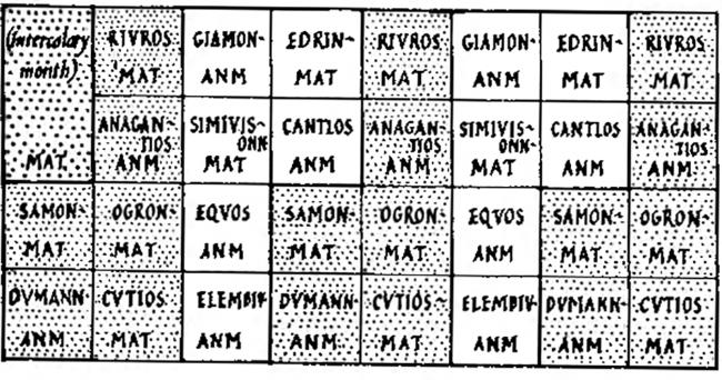 Само время состоит из постоянного чередования противоположностей: света и тьмы, тепла и холода, жизни и смерти. Календарь из Колиньи (галльский календарь, выгравированный на бронзовых пластинах и найденный во время археологических раскопок во Франции в 1897 г.) свидетельствует о еще более последовательной дихотомии применительно ко всем месяцам года. Хотя многие названия месяцев записаны сокращенно, что не позволяет с уверенностью их реконструировать, принципиальная структура календаря достаточно ясна. Он рассчитан на пять лет, что кажется нам знаменательным в свете свидетельства Диодора, что континентальные кельты обыкновенно приносят свои жертвы раз в пять лет. Эти пять лет состоят из 60 месяцев, дополненных двумя «интеркалярными» месяцами – одним в начале цикла, а вторым в середине. Второй дополнительный месяц делит, таким образом, весь цикл на две равные половины, по два с половиной года каждая. В календаре весь цикл записан в 16 столбцов (фиг. 2). В каждый столбец последовательно вписаны галльские названия месяцев, и читать каждый столбец надо сверху вниз.