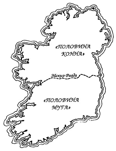 Во всей ирландской литературе северная половина острова традиционно называется «половиной Конна» (Leth Cuinn), а южная – «половиной Муга» (Leth Moga). Как имя нарицательное conn означает «глава, вождь; смысл, разум», a mug – «слуга, раб». Традиционная граница между двумя половинами Ирландии тянется вдоль пересеченного хребта низких гор Эйскир-Риада, идущего от Дублина до залива Голуэй, названия же обеих половин объясняются произошедшей в свое время ссорой между Конном, эпонимическим предком северной династии Дал Кунна, и Мугом Нуадатом («слугой Нуаду»), известным также под именем Эогана, эпонимического предка Эоганов, правителей Мунстера. Муг Нуадат, запасясь провизией на случай грядущего голода, овладел всем южным королевством16. Здесь уместно привести строфу из «Истории Ирландии», составленной в XVII в. Дж. Китингом17: