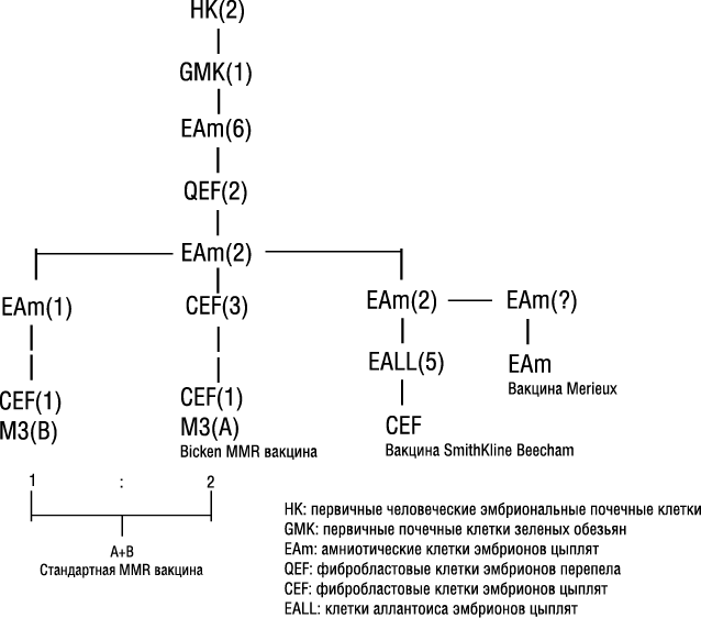 Для начала выделяют дикий штамм вируса из больного человека. После этого его 2 раза серийно проводят через человеческие эмбриональные почечные клетки. Потом вирус пересаживают в почечные клетки зеленых обезьян. Потом его 6 раз проводят через амниотические клетки зародышей цыплят, затем 2 раза через фибробластовые клетки зародышей перепела, потом снова проводят 2 раза через амниотические клетки цыплят. Ну а дальше по желанию. Можно провести 3 раза через фибробласты зародышей цыплят, а можно провести еще 2 раза через амниотические клетки цыплят, а потом еще 5 раз через аллантоис (эмбриональный орган дыхания) цыплят, а потом снова через фибропласты цыплят. Так получают различные вакцинные штаммы, которые также можно между собой смешивать. Компания «Мерк», например, использует не почечные клетки, а абортированные клетки легких. В общем, тут каждый производитель вакцин резвится в меру своего воображения.
