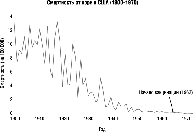 С 1920-х по 1960-е годы, до начала вакцинации, несмотря на то что количество случаев болезни оставалось постоянным, летальность кори снизилась на 99 % {4}.