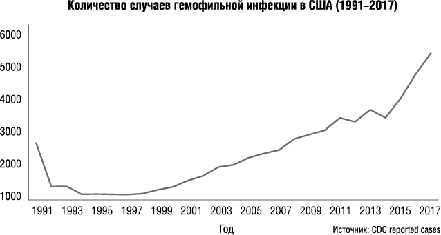 Показателен и график количества случаев гемофильной инфекции в США. Заболеваемость снижалась до середины 90-х, после чего из года в год неуклонно растет (см. график на с. 241).