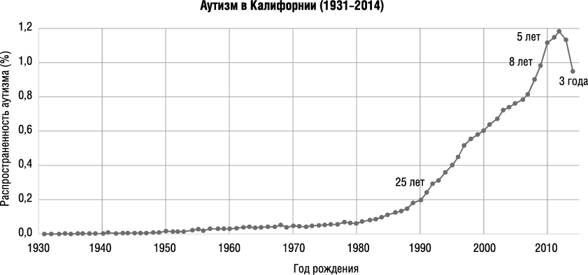 Среди рожденных в 1931 году в Калифорнии аутизм встречался у 1 из 100 000. Среди рожденных в 2012-м – у 1 из 85. Заболеваемость начала постепенно расти в 1940-х и резко увеличивалась для рожденных в 1980, 1990 и 2007 годах {22}.