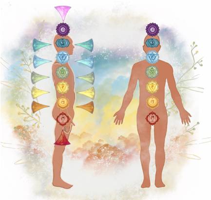 Если изобразить тело человека в профиль и расположить на нем чакры, то принцип их работы станет более понятен. Энергетические центры представляют собой вихревый поток (воронку) энергии, исходящий из внешнего мира в тело человека и выходящий обратно. Если изобразить ту же иллюстрацию в анфас, то мы увидим привычный образ чакр в виде дисков.