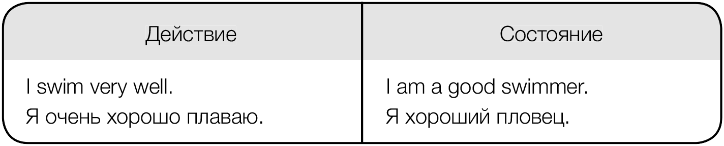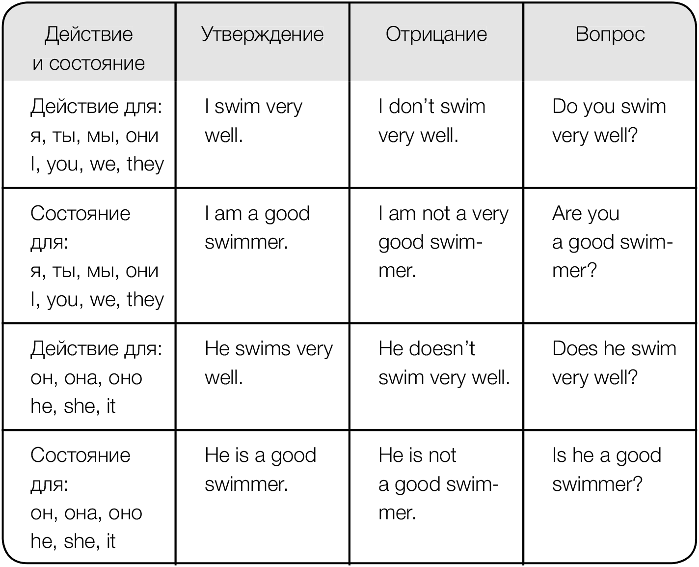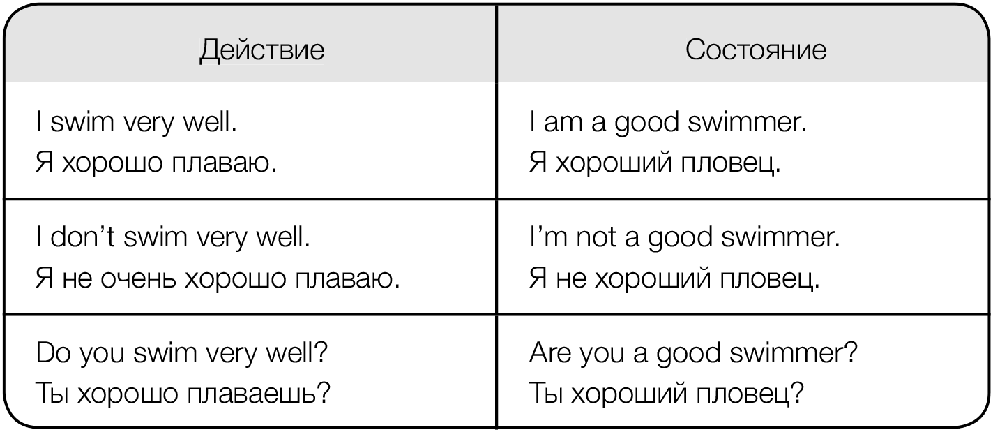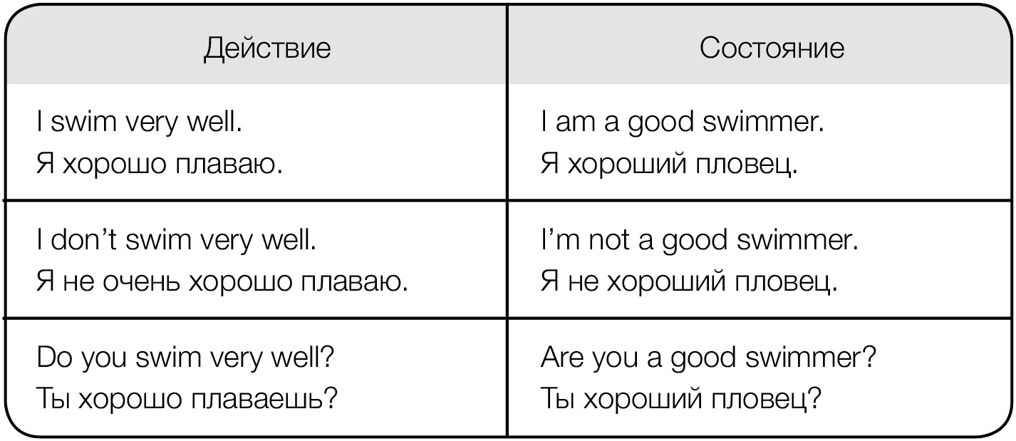 Обратите внимание, что смысл предложений – в принципе один и тот же. Но так же как и по-русски, говорящий по-английски может просто захотеть сказать о себе через глагол – действие «плавать», – а может захотеть описать себя существительным – пловец. Это выбор говорящего человека.