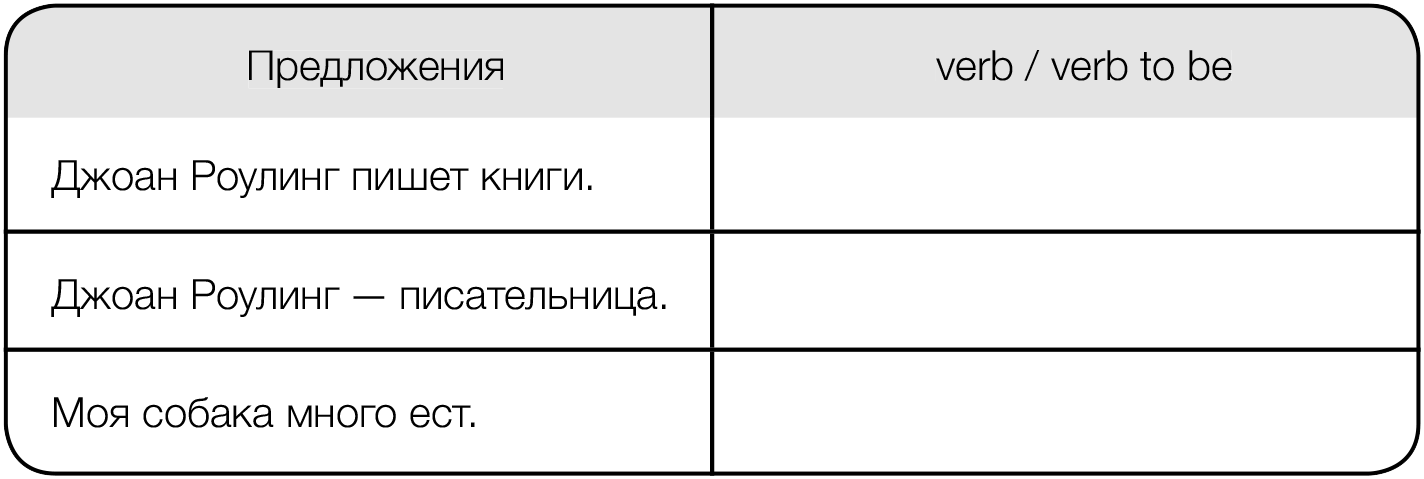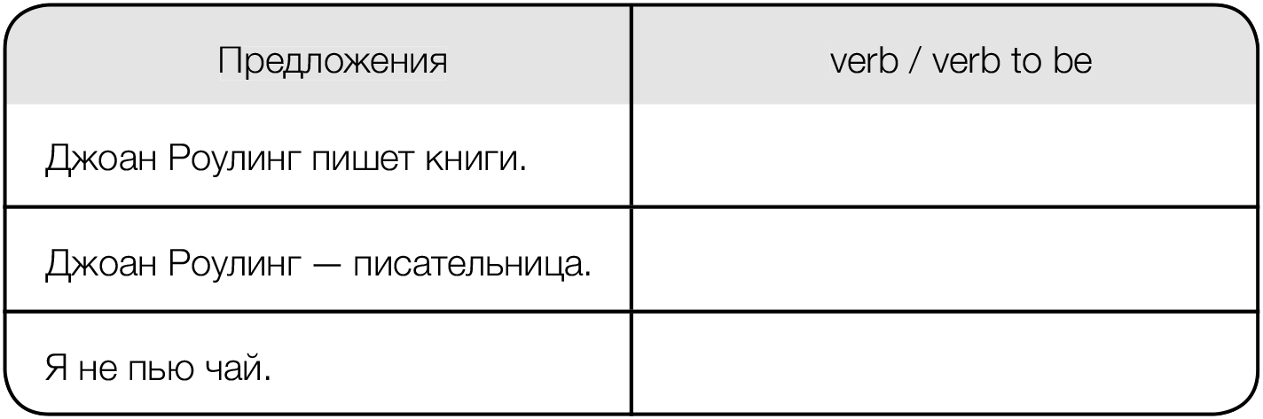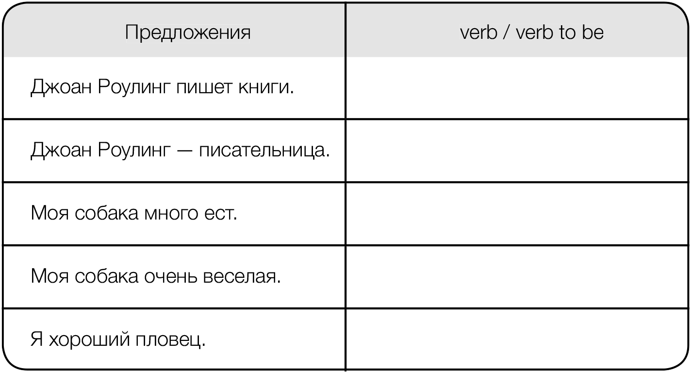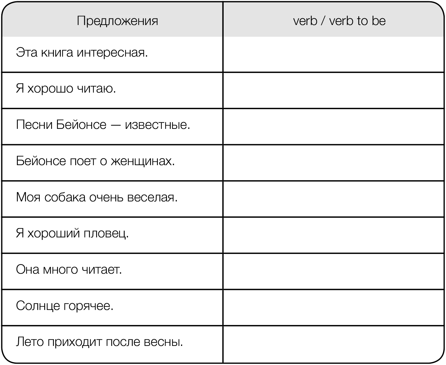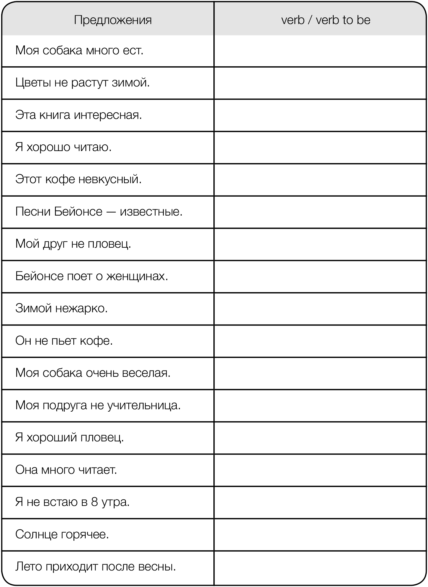 Давайте сразу потренируемся с определением, нужен ли вам глагол действия или глагол to be. Подпишите VERB – глагол действия или VERB TO BE – глагол to be, сами фразы пока можно не переводить:
